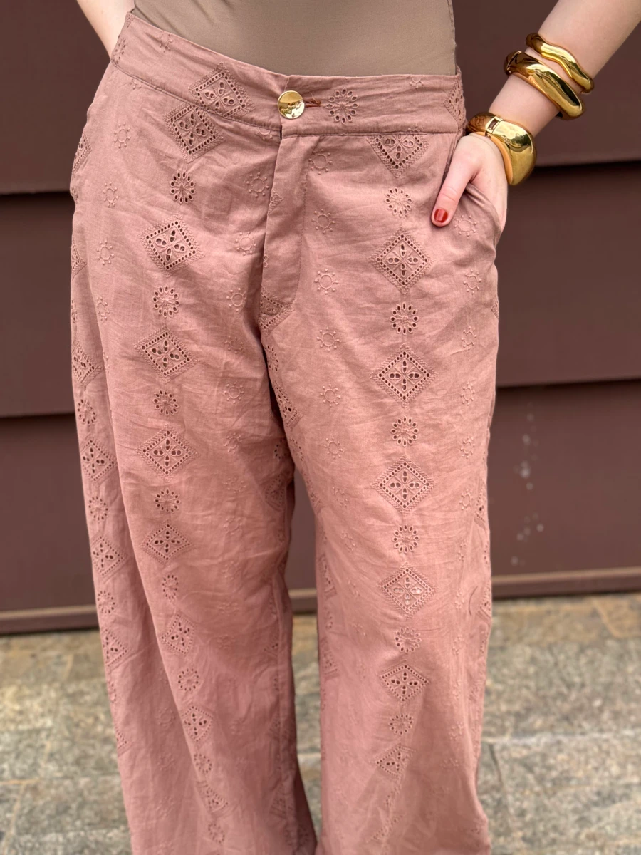 Calça confeccionada em tecido leve na cor marrom. Possui cintura baixa, pernas retas e modelagem larga. Conta com bolso interno, fechamento frontal por zíper e botão, além de forro.