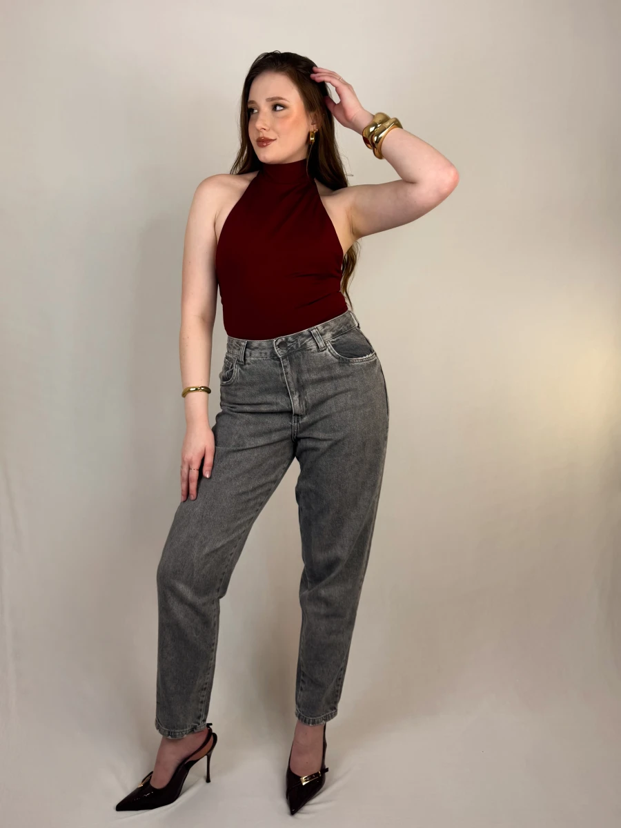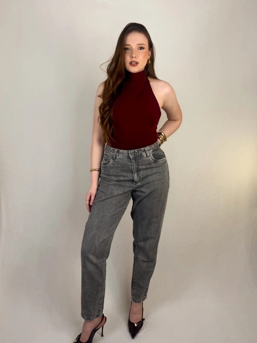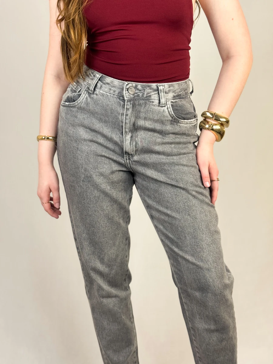Essa calça jeans tem o modelo mom com lavagem cinza. É uma peça que fica mais soltinha no corpo, confeccionada em um jeans grosso, mas confortável. Não é um jeans duro, e ainda ajuda a modelar o corpo.