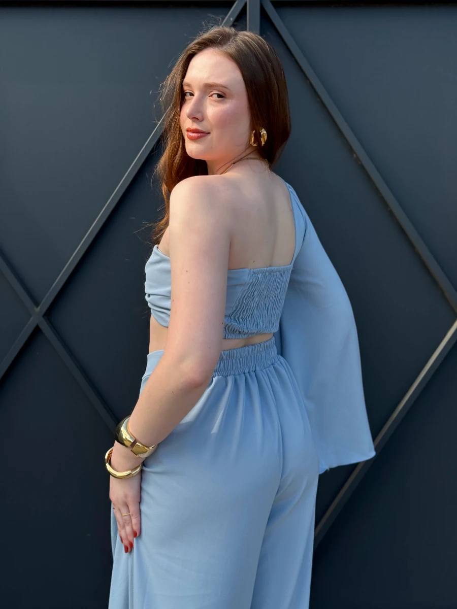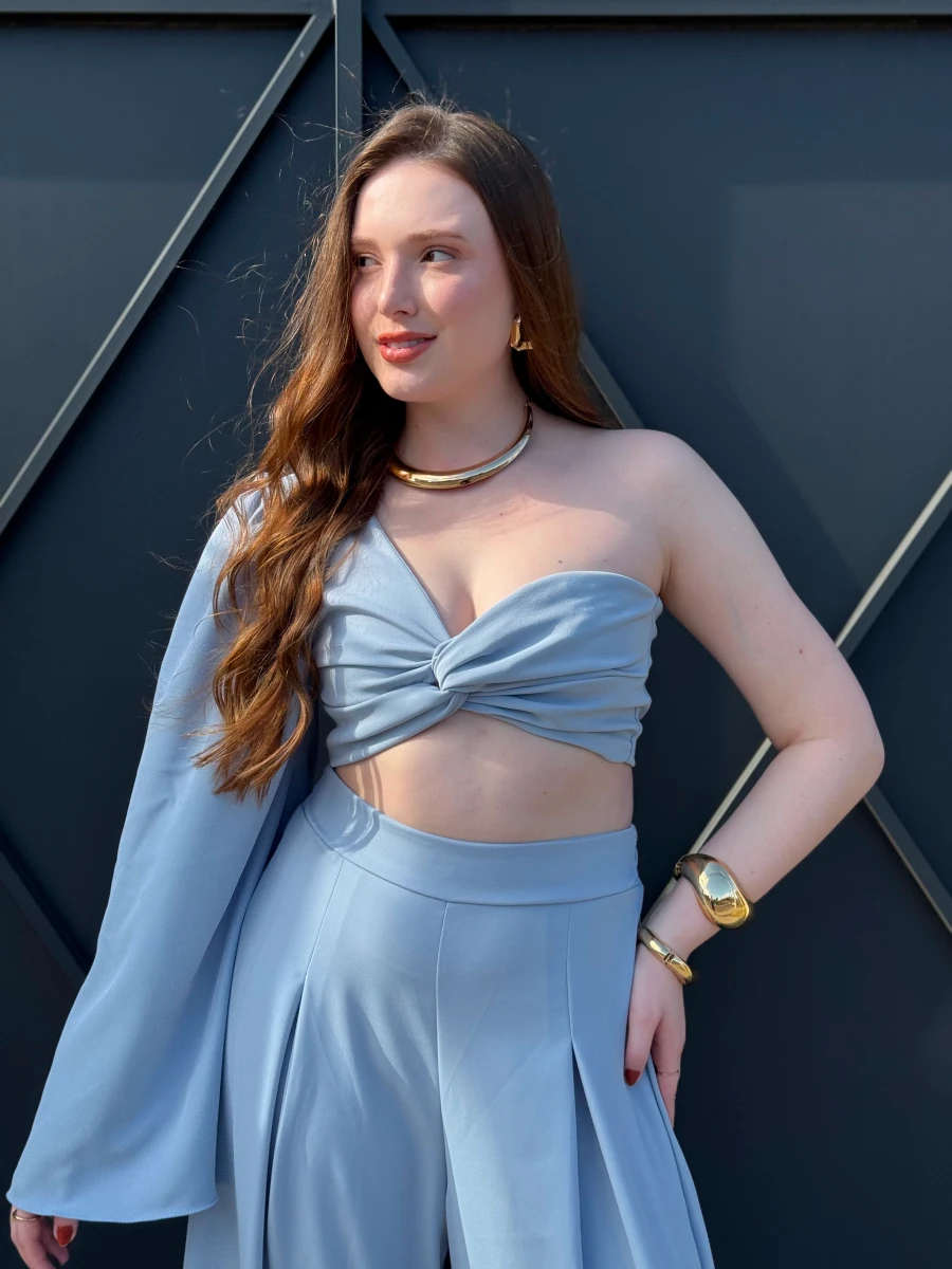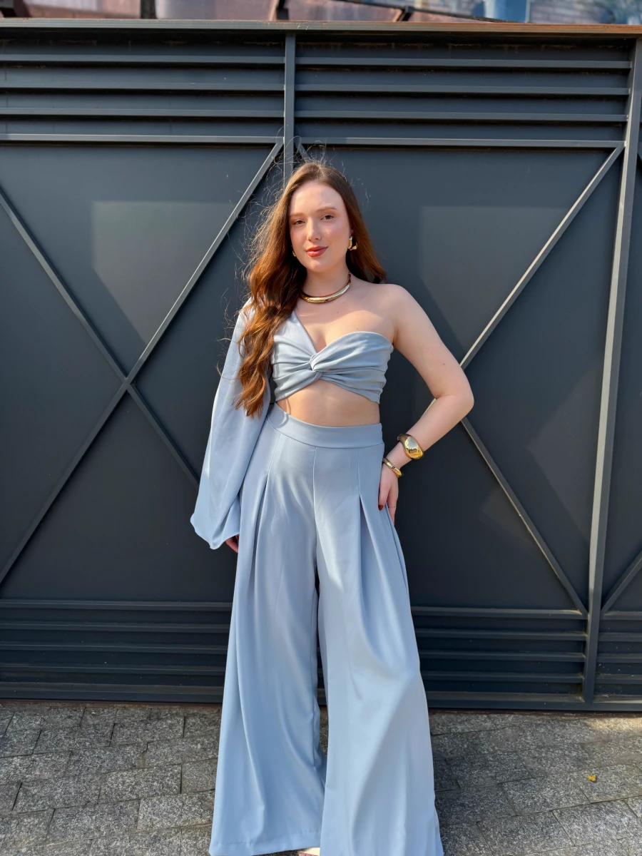 Conjunto confeccionado em tecido leve com caimento fluido e toque macio. Top assimétrico com nó frontal, manga longa única e calça pantalona de cintura alta