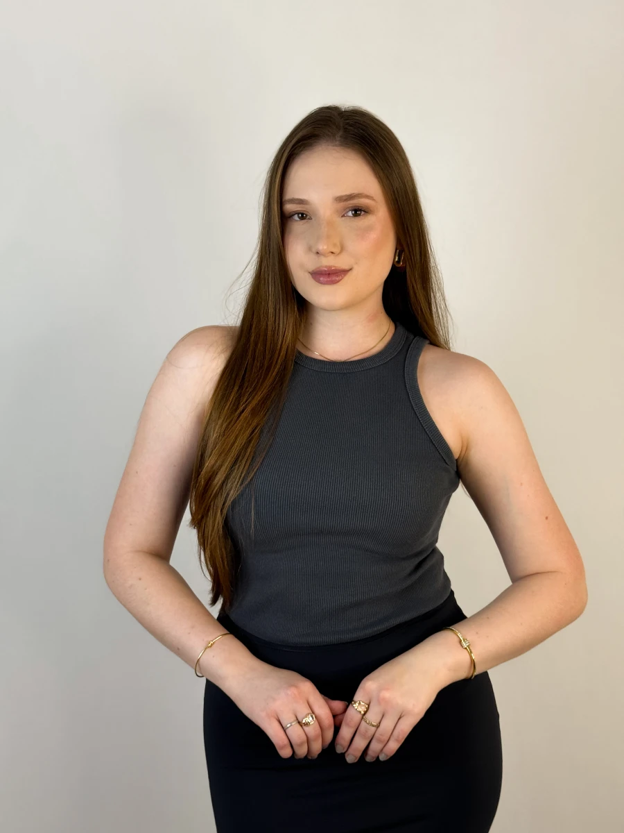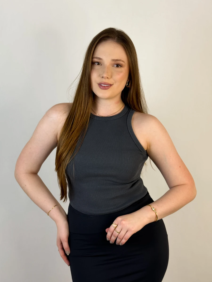 A Regata Básica Cinza Chumbo é aquele item indispensável no guarda-roupa! Confeccionada em tecido Ribana (50% algodão, 47% poliéster, 3% elastano), ela oferece o equilíbrio perfeito entre conforto e estilo. Seu caimento ajustado valoriza a silhueta, enquanto a modelagem versátil permite composições despojadas ou sofisticadas.
