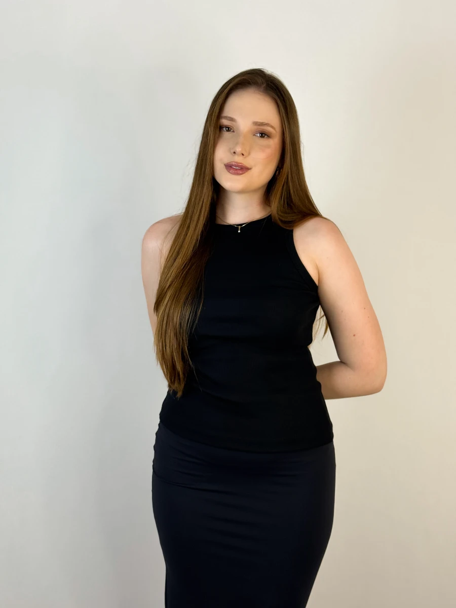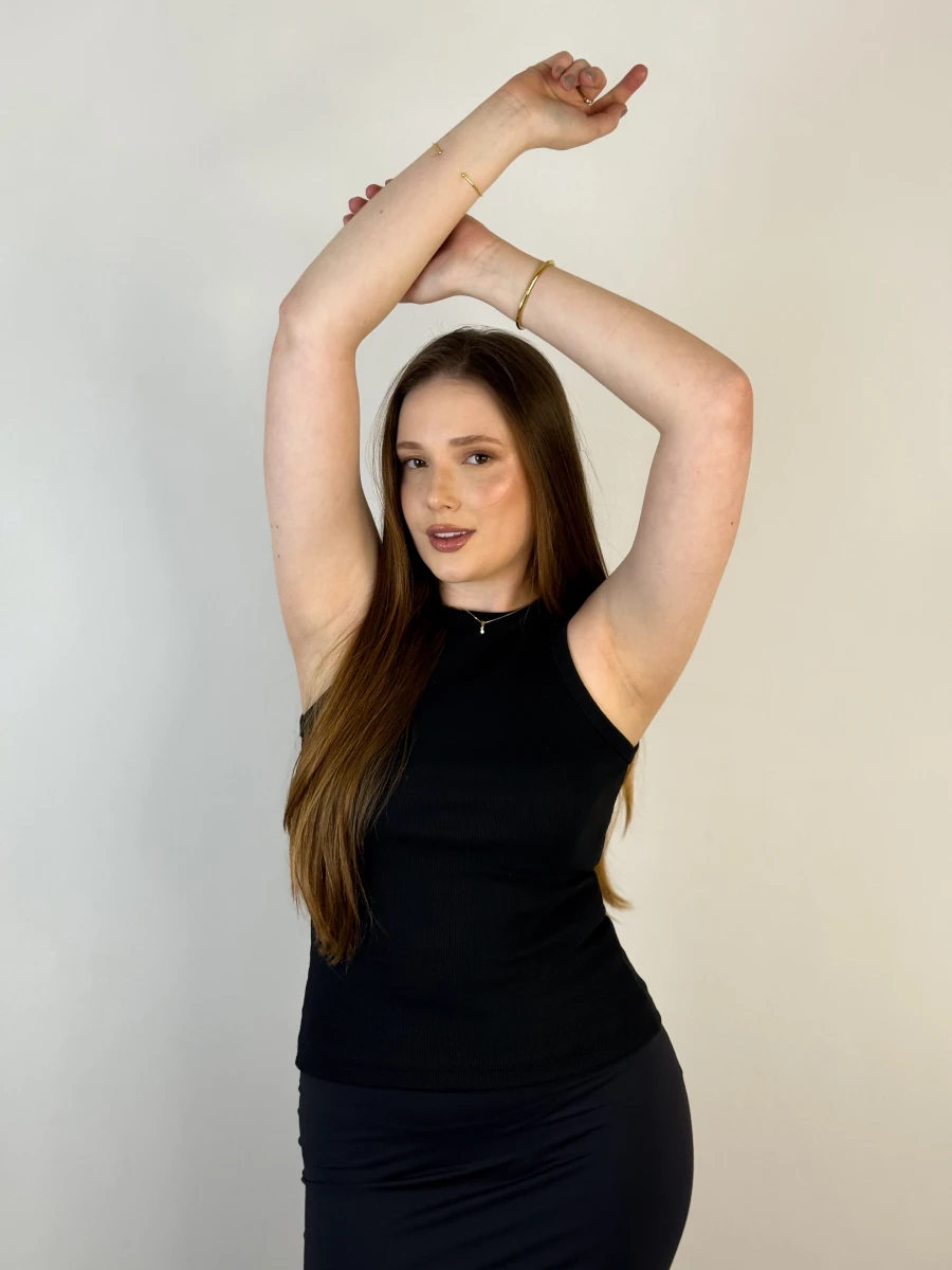 A Regata Básica Preta é aquele item indispensável no guarda-roupa! Confeccionada em tecido Ribana (50% algodão, 47% poliéster, 3% elastano), ela oferece o equilíbrio perfeito entre conforto e estilo. Seu caimento ajustado valoriza a silhueta, enquanto a modelagem versátil permite composições despojadas ou sofisticadas.