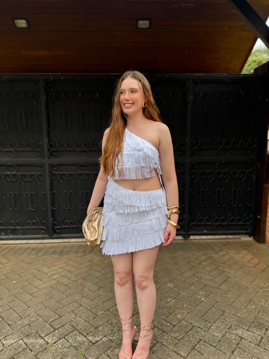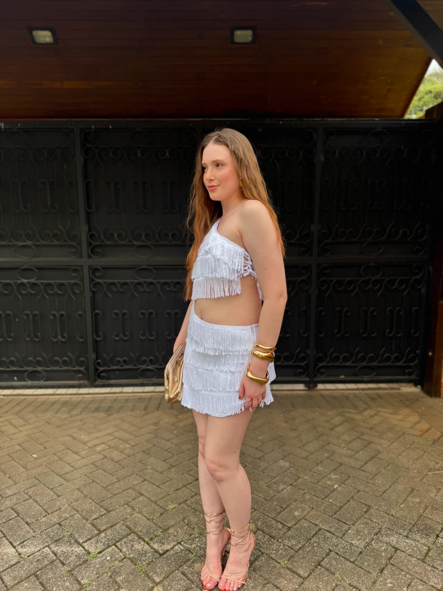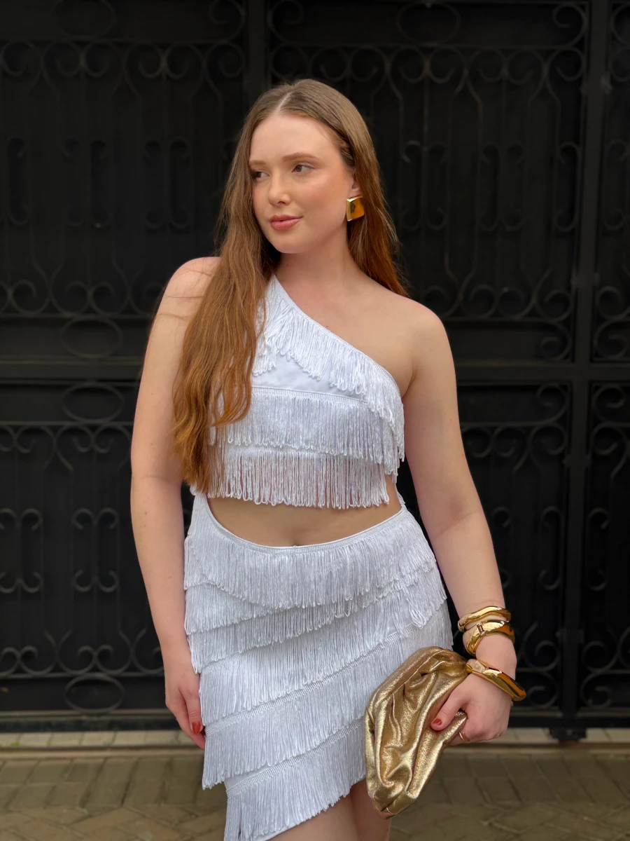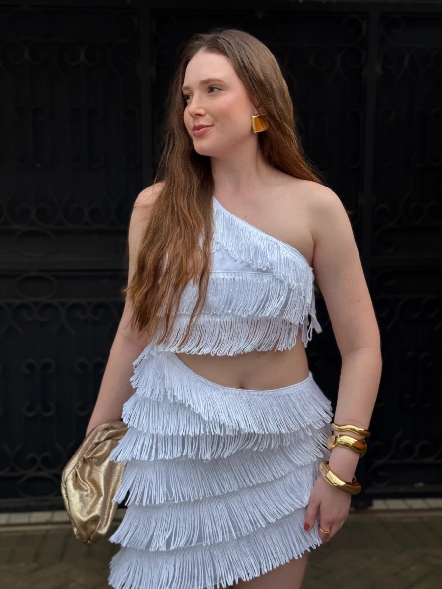 Vestido confeccionado em tecido leve com franjas aplicadas. Possui modelagem ajustada ao corpo, decote assimétrico de um ombro só e barra com acabamento em franjas